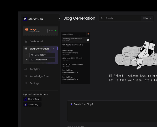 Copy.ai is built around outbound reach: prospecting, personalized outreach, and pipeline generation. MarketDay is built around inbound pull. Keyword research, competitor analysis, and SEO optimization are woven into every blog from the first draft, so each piece of content keeps earning traffic long after it goes live.